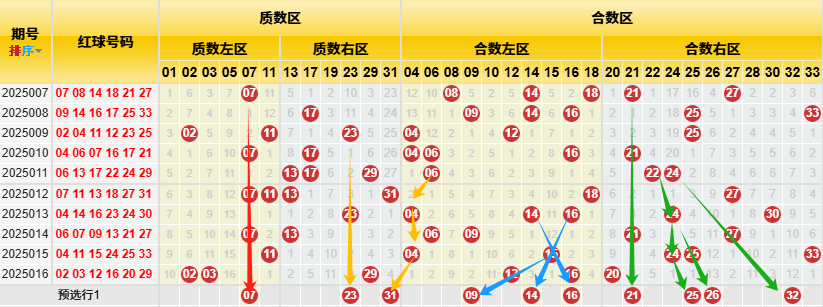 【数据参数】 根据前区质合小大属性,组合成上图质数区1、2、3、5、7、11、13、17、19、23、29、31和合数区4、6、8、9、10、12、14、15、16、18、20、21、22、24、25、26、27、28、30、32、33,质数区分为质数左区1、2、3、5、7、11和质数右区13、17、19、23、29、31;合数区分为合数左区4、6、8、9、10、12、14、15、16、18)和合数右区20、21、22、24、25、26、27、28、30、32、33。