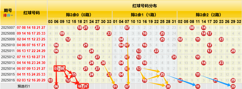 【数据参数】 根据前区除3余数,组合成上图分别为余0路(简称0路)3、6、9、12、15、18、21、24、27、30、33;余1路(简称1路)1、4、7、10、13、16、19、22、25、28、31; 余2路(简称2路)2、5、8、11、14、17、20、23、26、29、32。