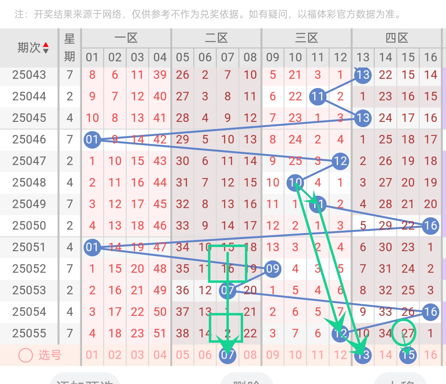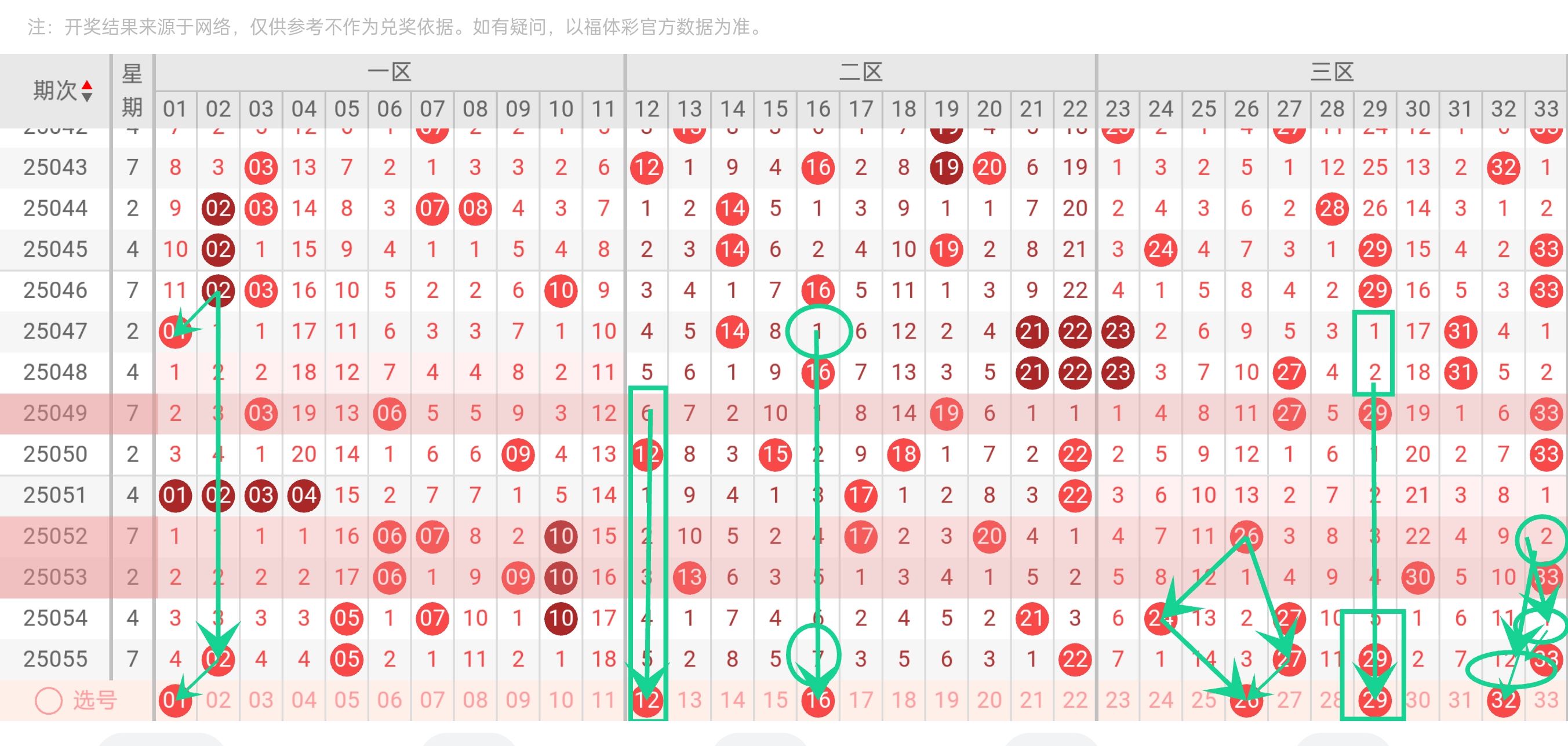 - 12-22(中号):选取 12、16、21,近期中号区热度回升(如2025042期“07,13,19”)。