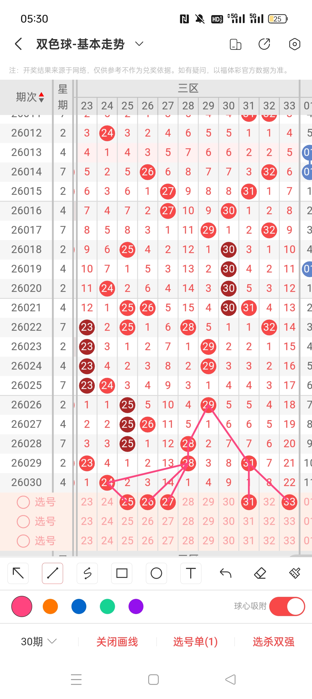 三区(23-33)近34期本区邻孤传8邻26孤0传,孤号热度高,本期着重邻传。近34期本区012路20:3:11,0/2路热度高,本着重1路。25已遗漏2期,与24之间呈现向右遗漏递减态势,需防。26、27分别遗漏3期、4期,两者与28之间呈现向左遗漏递减态势,需防。31、33分别遗漏1期、22期,两者与31之间呈现向右遗漏递减态势,需防。