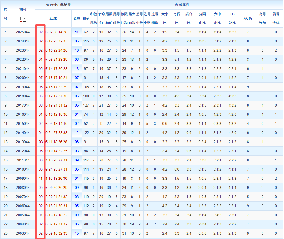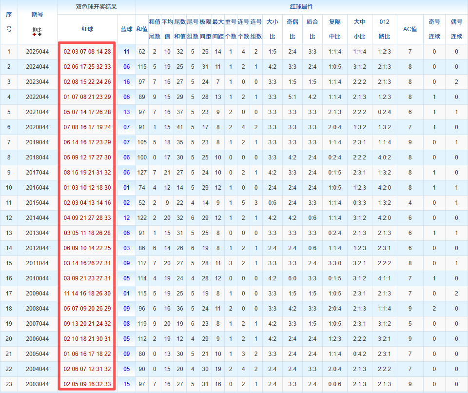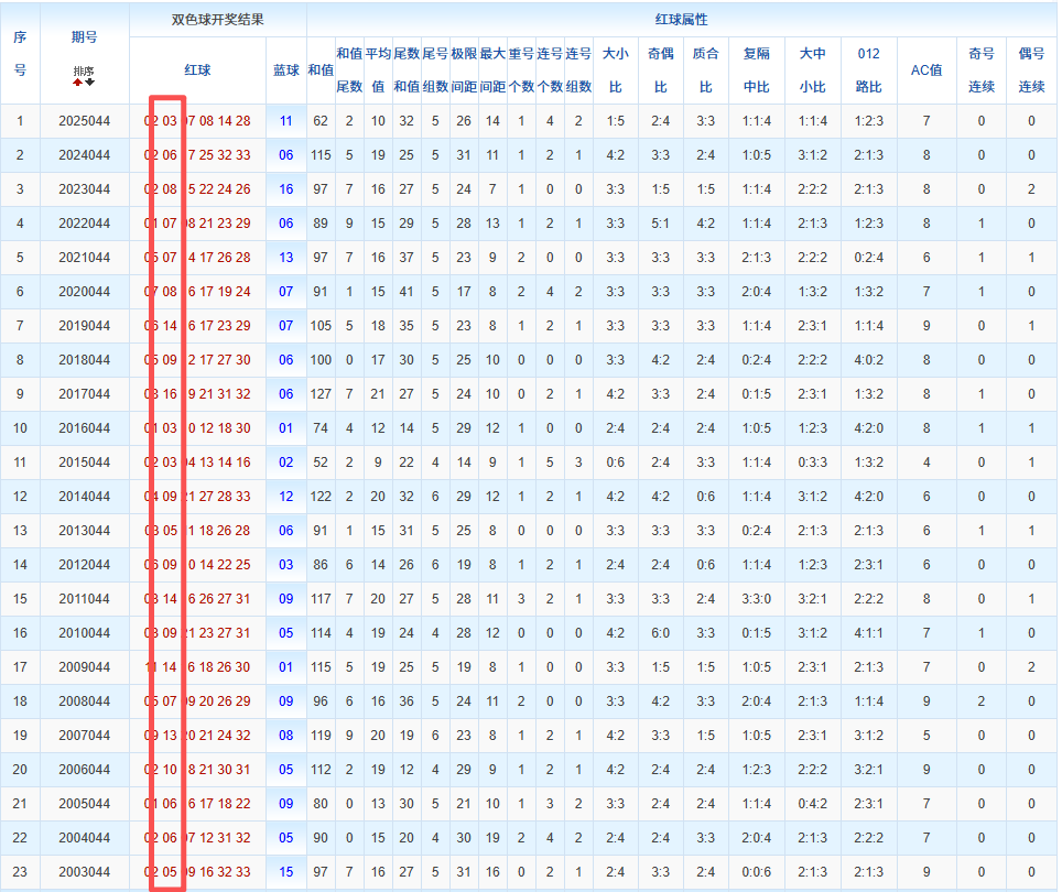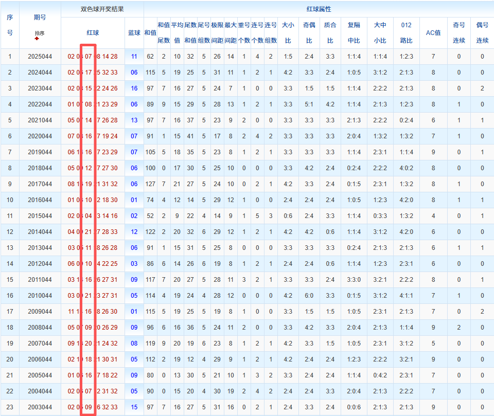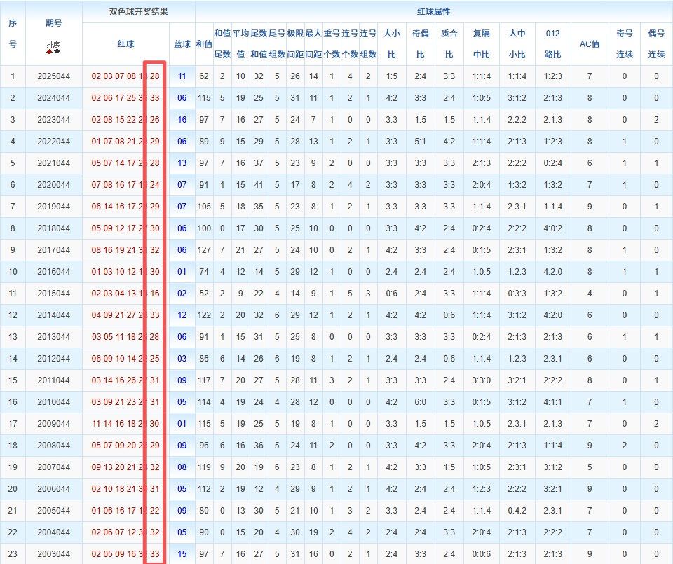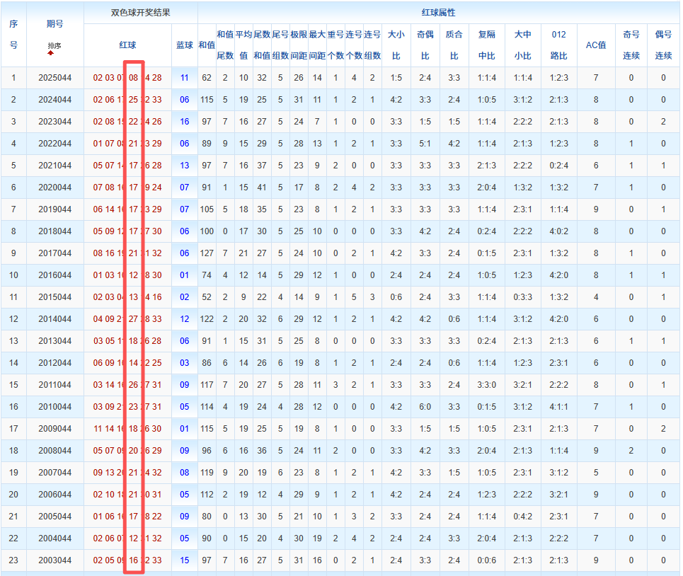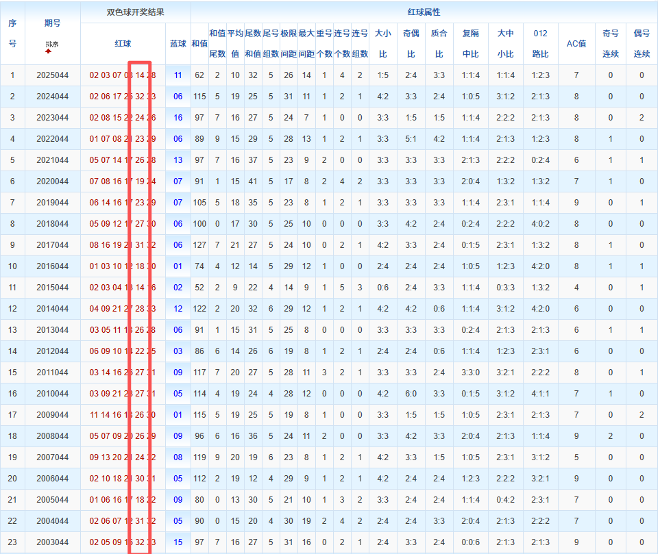 通过观察,我发现双色球往年同期的开奖数据与本期号码之间存在显著关联。具体来说,在红球中,从第一位至第六位,通常会有约4个位置上的数字与往年同期相同位置的号码一致;而蓝球号码中,也有多期开奖结果直接包含了往年同期的数字。因此,我们可以借助往年同期各位置上的号码,作为分析本期开奖情况的重要依据。在此基础上,还可结合往年同期的其他相关条件,进行综合性的号码组合推荐。