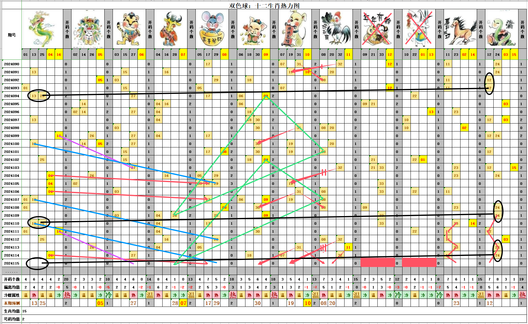 龙肖经过近几期的热开,热力从冷态进入热态,已蜕变成热肖本期出红球的概率极高。根据上图黑色划线可知,蛇肖一旦出现重码,下期出红球13、25是高概率事件,因此本期需要重点防守的红球13、25
