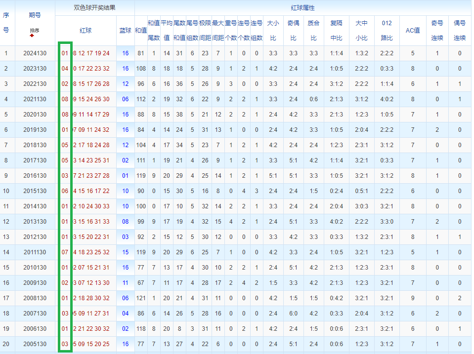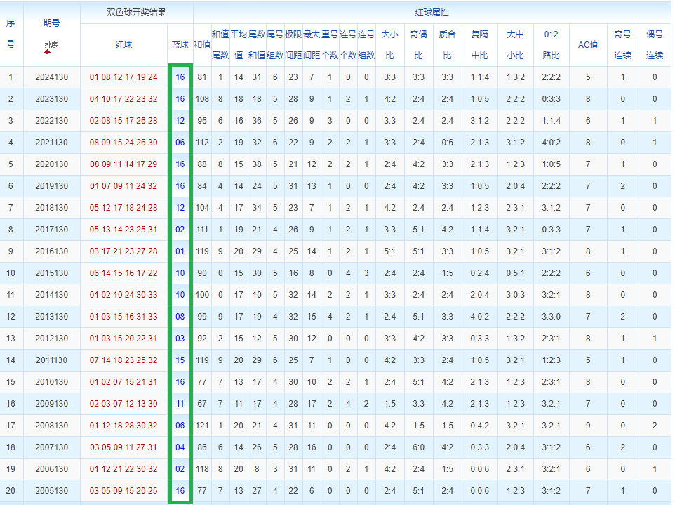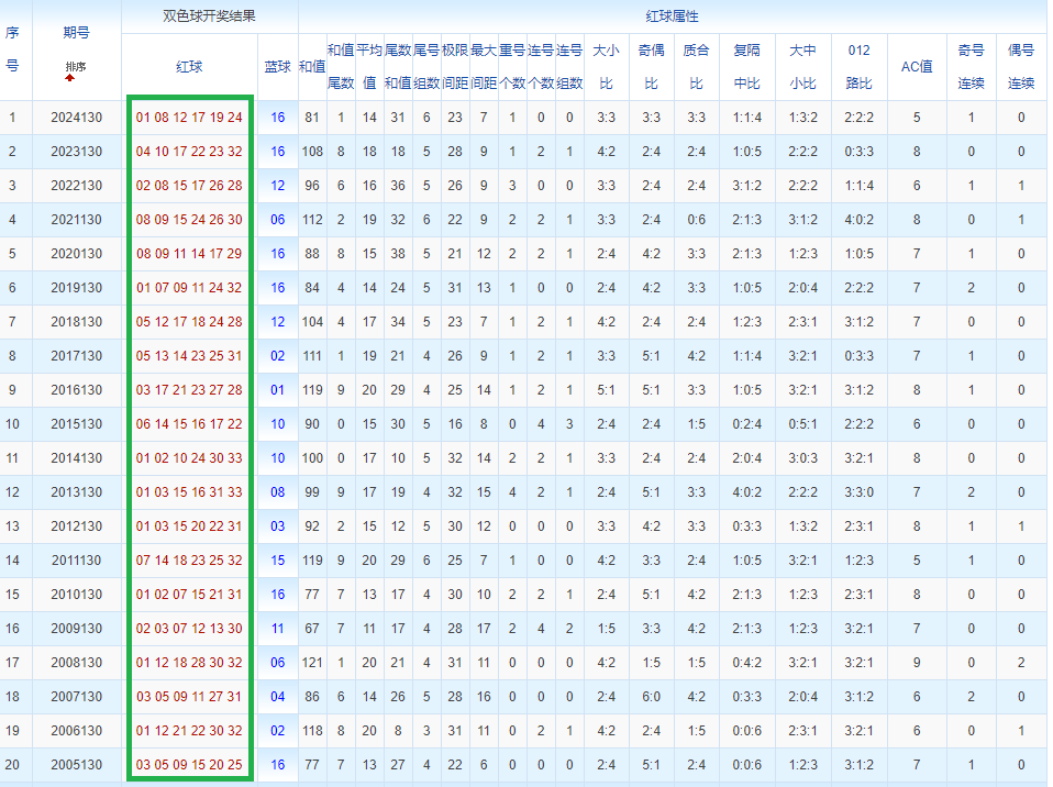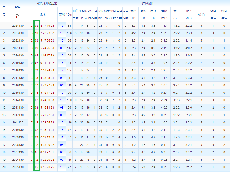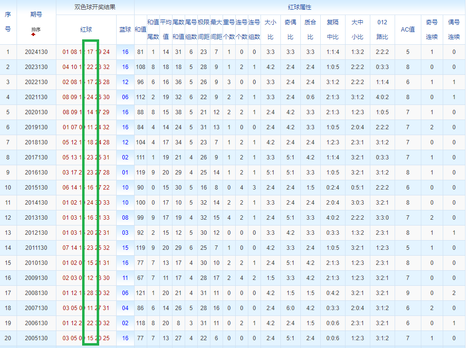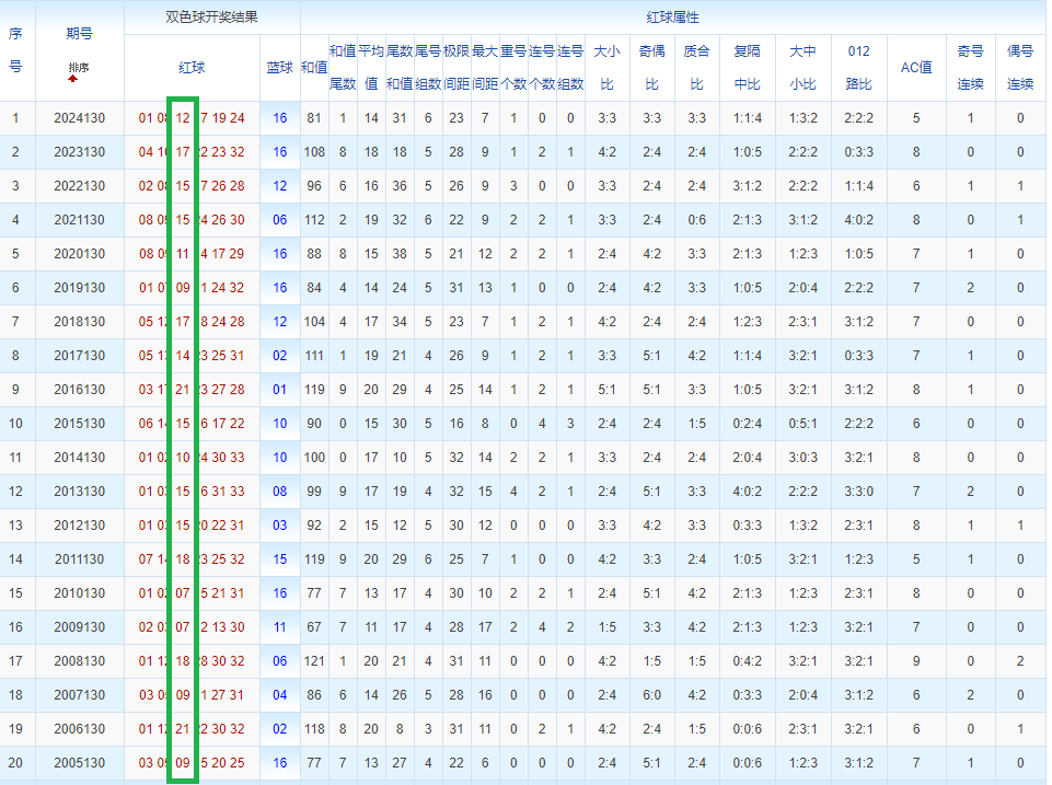 通过观察,我发现双色球往年同期的开奖数据与本期号码之间存在显著关联。具体来说,在红球中,从第一位至第六位,通常会有约4个位置上的数字与往年同期相同位置的号码一致;而蓝球号码中,也有多期开奖结果直接包含了往年同期的数字。因此,我们可以借助往年同期各位置上的号码,作为分析本期开奖情况的重要依据。在此基础上,还可结合往年同期的其他相关条件,进行综合性的号码组合推荐。