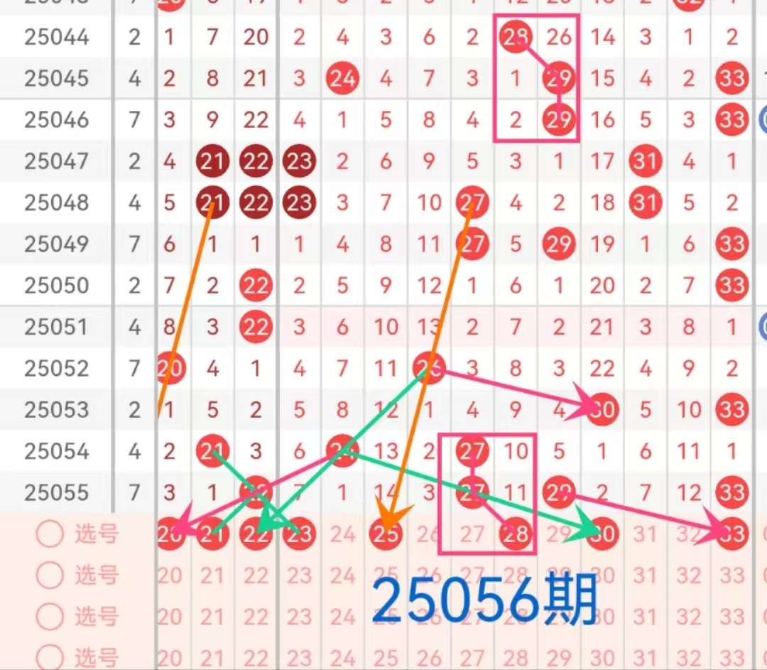 3. 第三区间(23-33):此区间在上期开出三个号码27、29和33,号码27重复开出,形成重号形式。号码29遗漏5期后开出,号码33为该期的凤尾号码,这是一个最大的凤尾在相隔一期后再次开出。从历史数据来看,该区间内的号码出现频率高,预计本期该区间会有号码继续开出。博士认为本期该区出号1-2个,因此本期可关注该区间内的号码,如23、25、28、30、33。