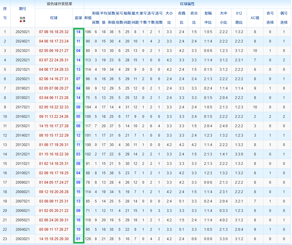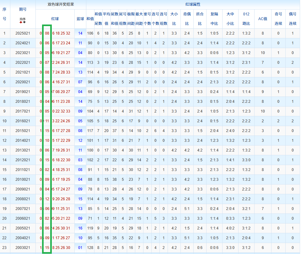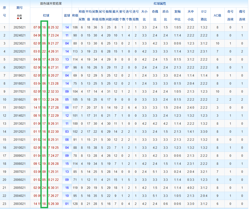 通过观察,我发现双色球往年同期的开奖数据与本期号码之间存在显著关联。具体来说,在红球中,从第一位至第六位,通常会有约4个位置上的数字与往年同期相同位置的号码一致;而蓝球号码中,也有多期开奖结果直接包含了往年同期的数字。因此,我们可以借助往年同期各位置上的号码,作为分析本期开奖情况的重要依据。在此基础上,还可结合往年同期的其他相关条件,进行综合性的号码组合推荐。