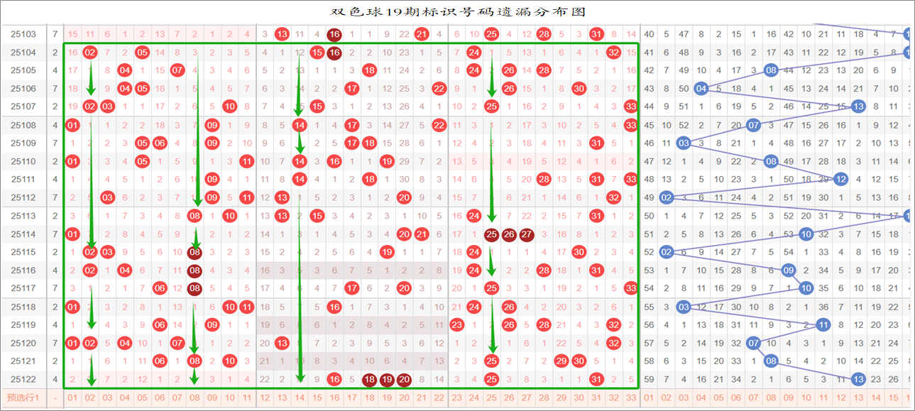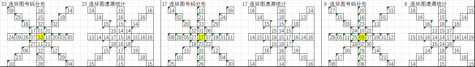 由于数据量大,不一一统计,下图为各个号码分别在33、17、9连环图上的遗漏统计汇总图: