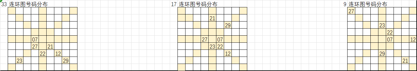 我的思路主要是统计分析九转连环图,彩虹官方平台上也有分布图,我们先来看看原理。九转连环图是宋代数学家杨辉的“幻圆”演变而来的,每个圆环、每条轴(不含中心数字)的和值均相等。经过各位前辈老师不断改进应用,形成了以中心数字为33、17、9的连环图,保持每个圆环、每条轴等和值的特点,这里要感恩古代文化的博太精深,也要感谢各位前辈推演应用的方法。