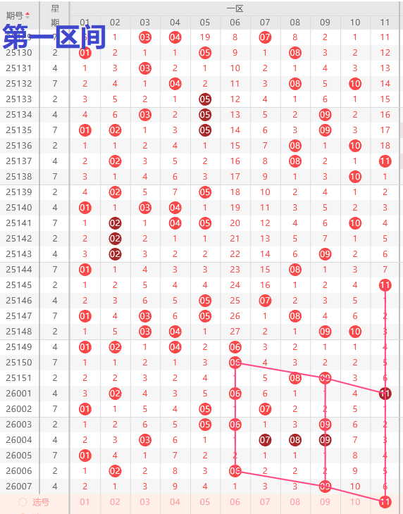 一区间号码分析:11号码球为06到09再到11与往期走形形态相同并且形成对角汇报形态,还有11号码球往期隔期回补本期也是隔六期回补形成隔六期三重走势形态,综上所述满足三个支撑点条件,所以定11号码球是一区间重点关注号码。