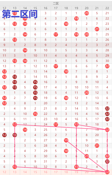 二区间号码分析:22号码球为往期13下落后回补22形成对角关系还有19下落后也回补22还有13和19同时下落时近期也回补22形成同形态走势,综上所述满足三个支撑点条件,所以定22号码球是二区间重点关注号码。