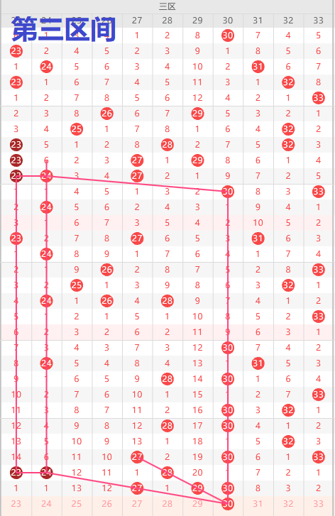 三区间号码分析:30号码球为近期23和24同时下落时回补30形成同形态走势并且27到28到29再到30形成四斜连走势形态还有30近期多次走双重走势还属于热态号码球要重点关注,综上所述满足三个支撑点条件,所以定30号码球是三区间重点关注号码。