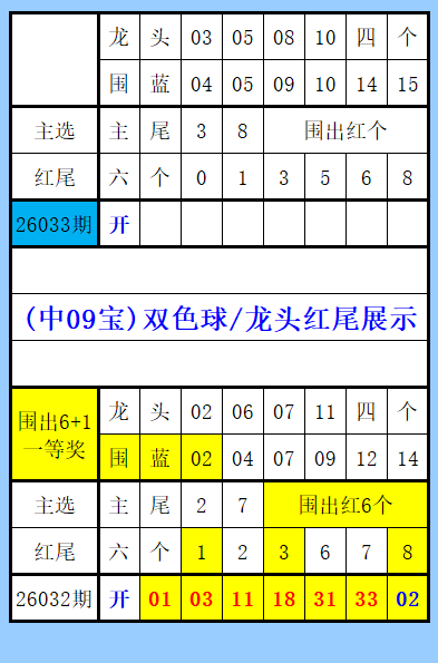 双色球第26033期(综合图文),单选推荐,上期围中6+1一等奖