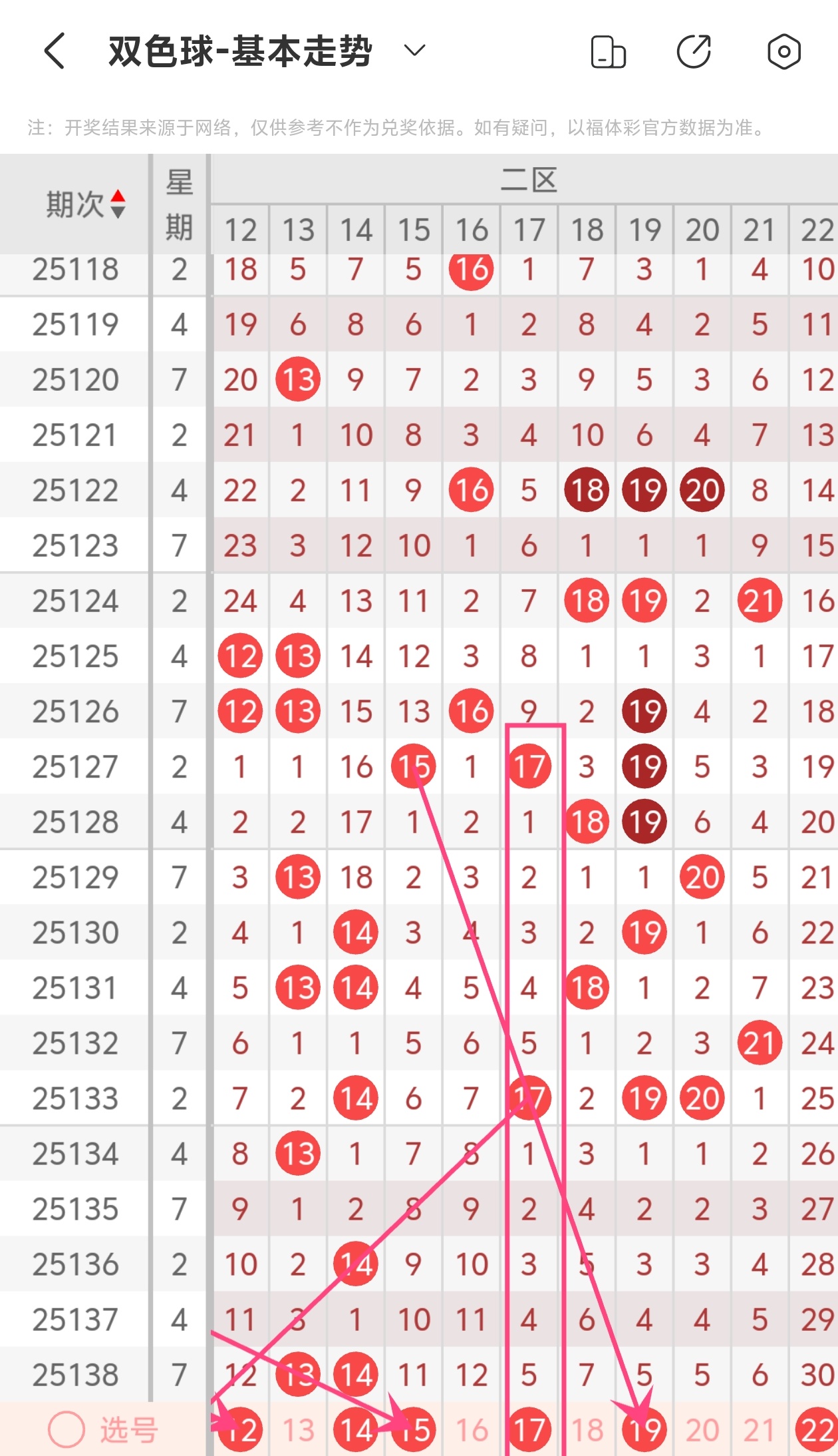 上期第二区间开出13 14,本期我们可以从上面走势图中看到选号的思路,12为斜连走势,14为重码,15为斜连走势,17为对称走势,19为斜连走势,综合以上分析本期第二区间推荐12 14 15 17 19 22