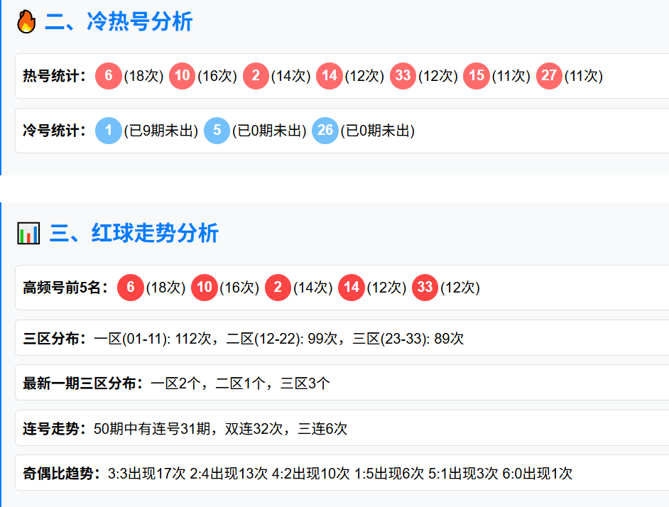 观察红球三区分布,一区(01-11)上期出2个,二区(12-22)1个,三区(23-33)3个,显示三区相对均衡,但三区稍显活跃,提醒大家关注尾区的数字动态。近50期的连号走势显示,连号出现31期,其中双连32次,三连6次,可见连号并非罕见现象,尤其是双连更值得留意。奇偶比趋势方面,3:3出现17次,2:4出现13次,4:2出现10次,其他组合相对少见,这意味着奇偶平衡是近期的一种常态。