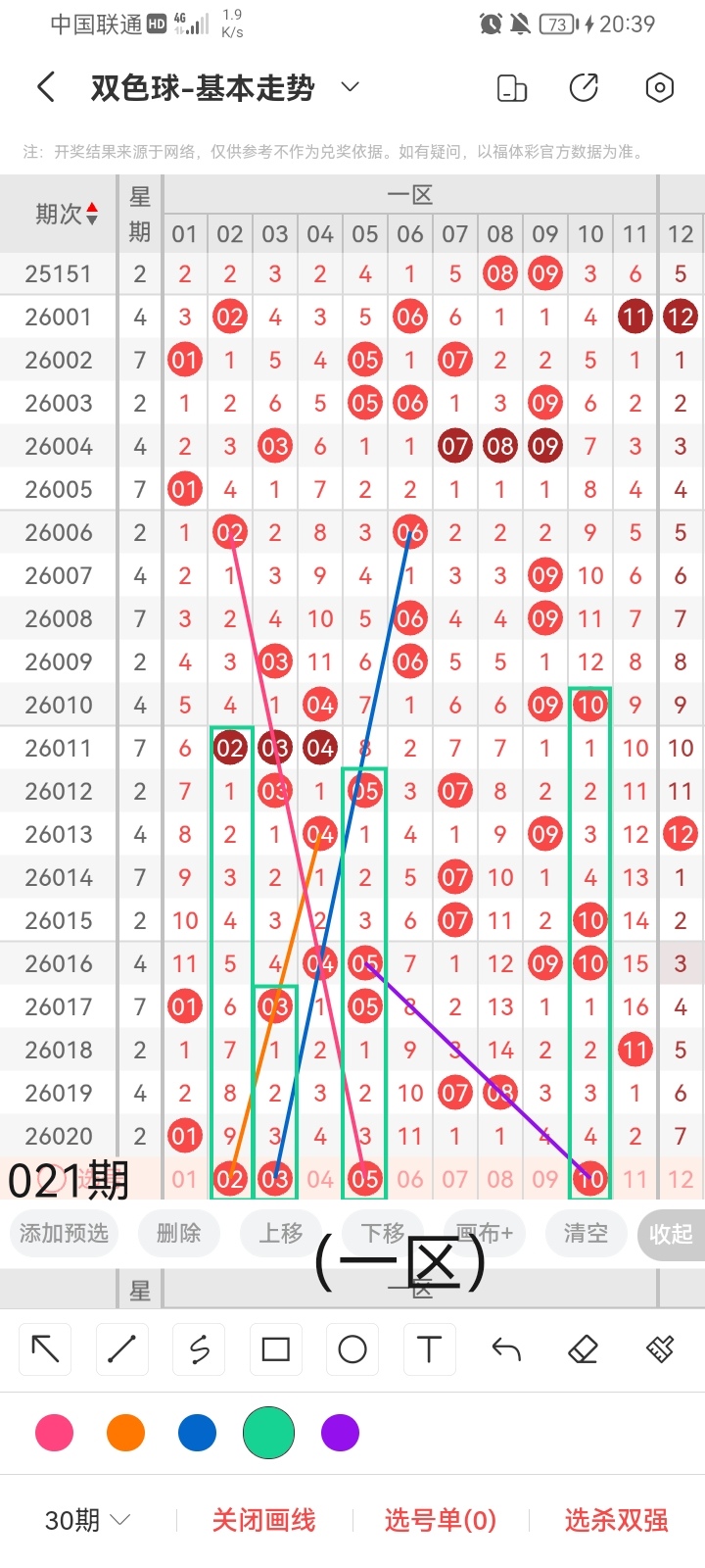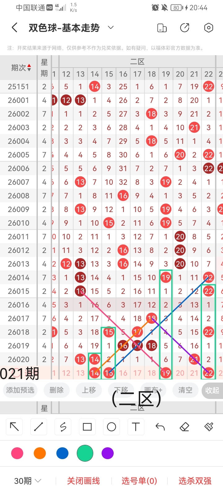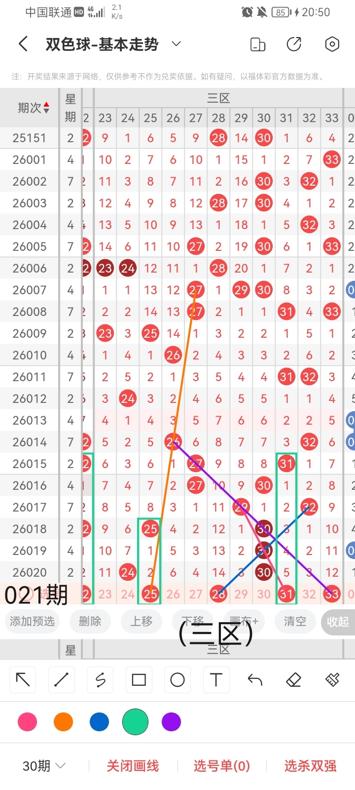 小梁结合上面图中画线思路分析得出,最后给大家汇总提供一下本期红球、蓝球数据,供大家参考: