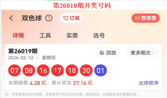 · 2026019期(2月12日) 红球:07、08、16、17、18、30 | 蓝球:01