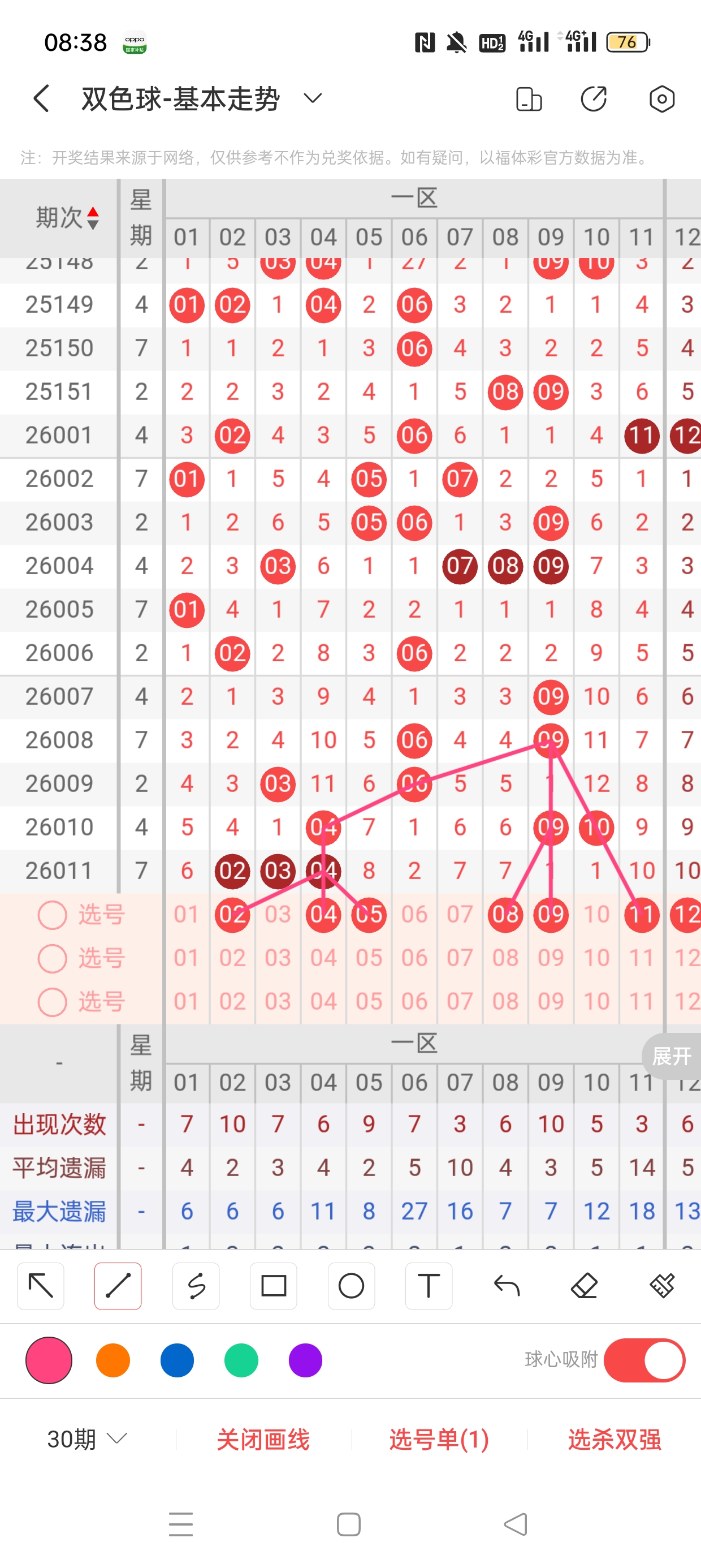 后区(1-16)近16期本区012路2:2:12,2路热度高,本期着重0/1路。2已遗漏9期,与4之间呈现向左遗漏递减态势,需防。9已遗漏37期,与12之间呈现向左遗漏递减态势,需防。