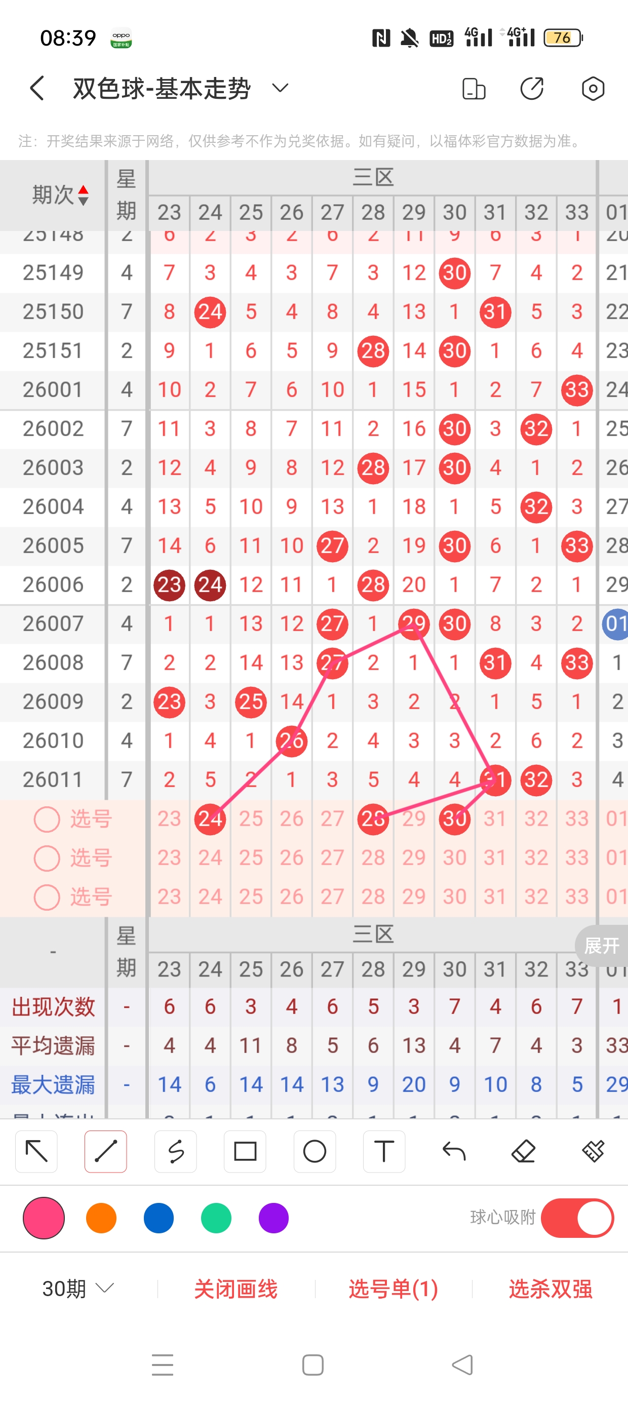 三区(23-33)近16期本区邻孤传6邻10孤0传,孤号热度高,本期着重邻传。近16期本区012路10:1:5,0/2路热度高,本着重1路。24已遗漏5期,与26之间呈现向左遗漏递减态势,需防。28、30分别遗漏5期、4期,两者与31之间呈现向左遗漏递减态势,需防。