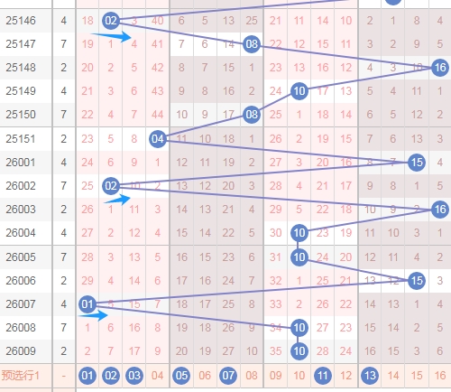 上图是福彩双色球红球号码走势图,我在上面标注出来的蓝色小箭头都是隔一期的数字和重复号码,你们会发现上期开出的号码都是热号码,都是遗漏周期小的数字,那么本期个人观点就是关注遗漏周期大的数字,那么这几个红球号码数字04 10 14 15 17 26至少会出现1个或者2个。
