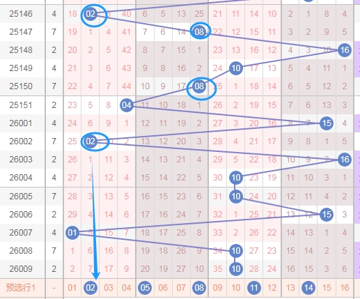 上图是福彩双色球蓝球开奖号码分布走势图,我在上面走势图中标注出来的数字都是2路球数字,从201路数字分析来看,上面走势图中标注出来的蓝色箭头就知道,最近2路球数字02 05 08 11 14已经连续7期没出现,那么本期大家要留意一下出2路球数字。
