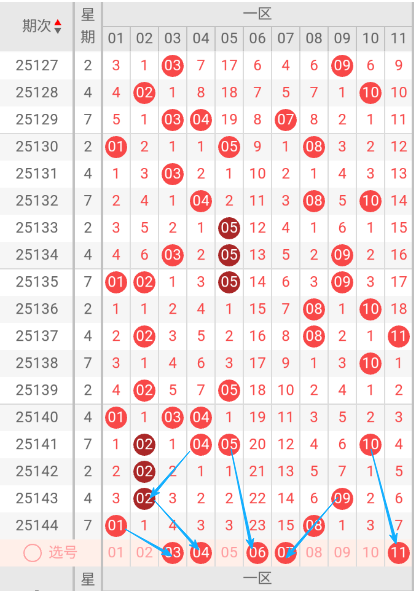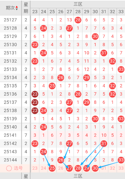 根据走势图可以看出当前区,135期开出25.32二个号码球 ,136期开出23.28.32三个号码球 ,137期开出23.27.29三个号码球 ,138期开出23.24.27三个号码球 ,139期开出30.33二个号码球 140期开出24一个号码球 ,141期没有开出个号码球 ,142期开出03.27.31三个号码球 ,143期开出24一个号码球 ,144期开出26.33二个号码球 ,按照如此规律判断本期当前区可能开出1单1双。我们看下当前区上期没有开出重叠号,那么本期当前区要定重叠号的情况下可关注33码球。再看下当前区上期没有开出斜连号,当期选号得留意25斜连号。本区重点关注25.27.28.29.30