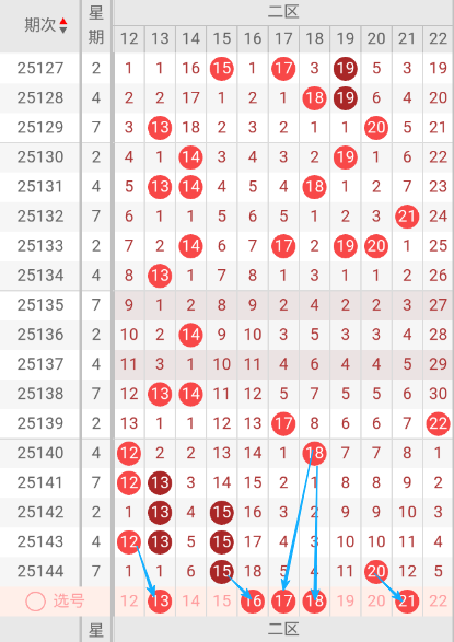 根据走势图可以看出当前区段,135期没有开出号码球 ,136期开出14一个号码球 ,137期没有开出号码球 ,138期开出13.14二个号码球 ,139期开出17.22二个号码球 ,140期开出12.18二个号码球 ,141期开出12.13二个号码球 ,142期开出13.15二个号码球 ,143期开出12.13.15三个号码球 ,144期开出15.20二个号码球 ,按照如此规律本期当前区可能开出2单。我们看下当前区上期开出15重叠号,那么本期当前区要定重叠号的情况下可关注20号码球。再看下当前区上期没有开出斜连号,当期选号得留意斜连21号码球。本区重点关注13.16.17.18.21