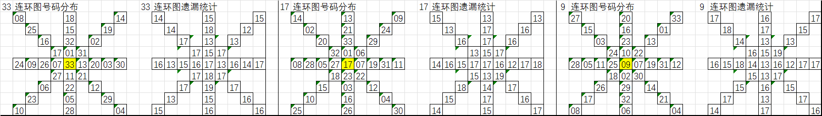 由于数据量大,不一一统计,下图为各个号码分别在33、17、9连环图上的遗漏统计汇总图: