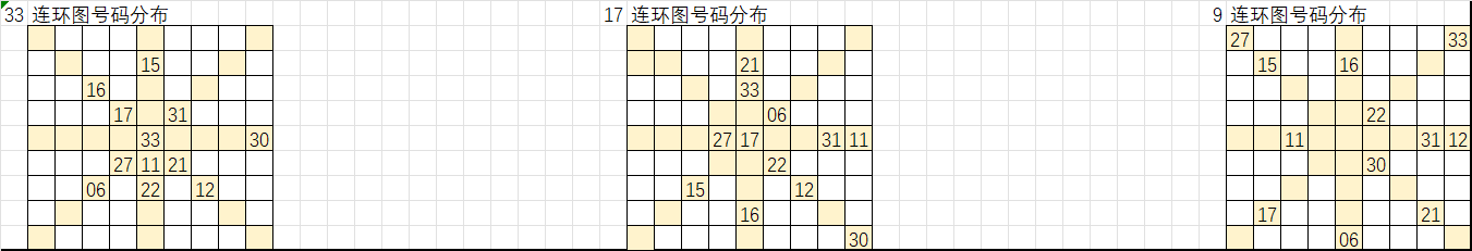以上是遗漏大于16的号码分别在33、17、9连环图的分布,按照九转连环图选号规律,选取这些号码“环上”和“轴上”的相邻号码作为胆码,把这些胆码进行次数统计即可形成我们组号的排序,从出次多到少进行取号得出我们的大底。
