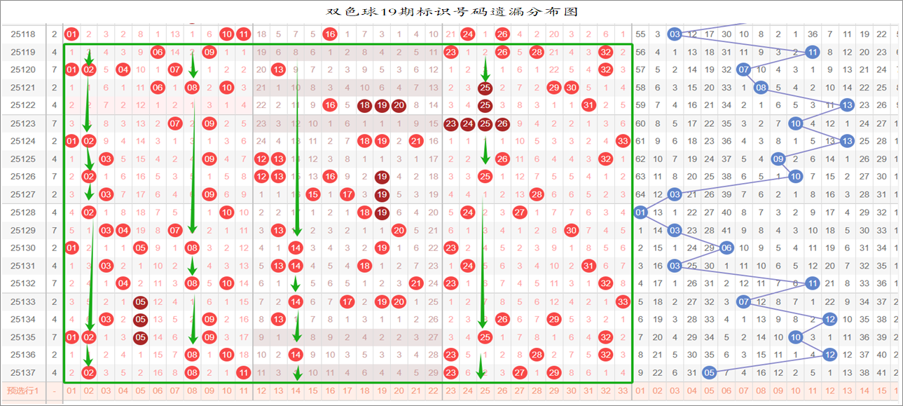 以上是33、17、9的连环图,可以在一起彩平台的九转连环图中查看历期号码分布,以当前期数来看,我们以19期号码来进行遗漏统计,然后把每个号码在近19期的遗漏总数统计出来,分别带入33、17、9的连环图,取出遗漏值大于16的号码,把这些号码在“环上”和“轴上”的相邻号码取出来进行统计,选取出次前15的号码作为大底。