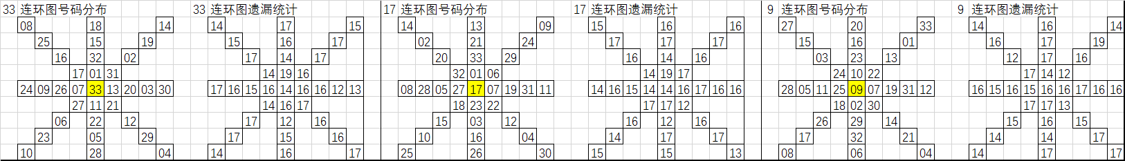 由于数据量大,不一一统计,下图为各个号码分别在33、17、9连环图上的遗漏统计汇总图: