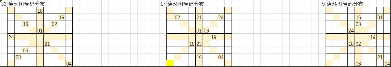 以上是33、17、9的连环图,可以在一起彩平台的九转连环图中查看历期号码分布,以当前期数来看,历史同期共有19期(2003-2023),那么我们就以19期号码来进行遗漏统计,然后把每个号码在近19期的遗漏总数统计出来,分别带入33、17、9的连环图,取出遗漏值大于16的号码,把这些号码在“环上”和“轴上”的相邻号码进行统计,选取出次前15的号码作为大底。