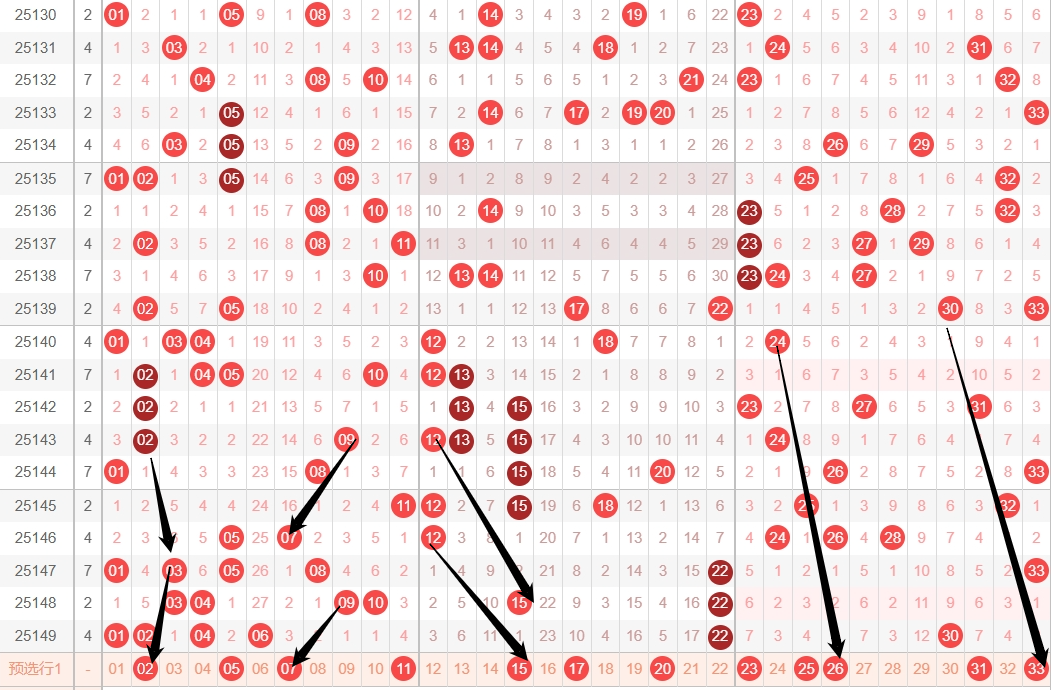 回顾上期25149期开奖01 02 04 06 22 30+ 10 ,其中一小区01-11出4个,二小区12-22出1个号,三小区23-33出1个!