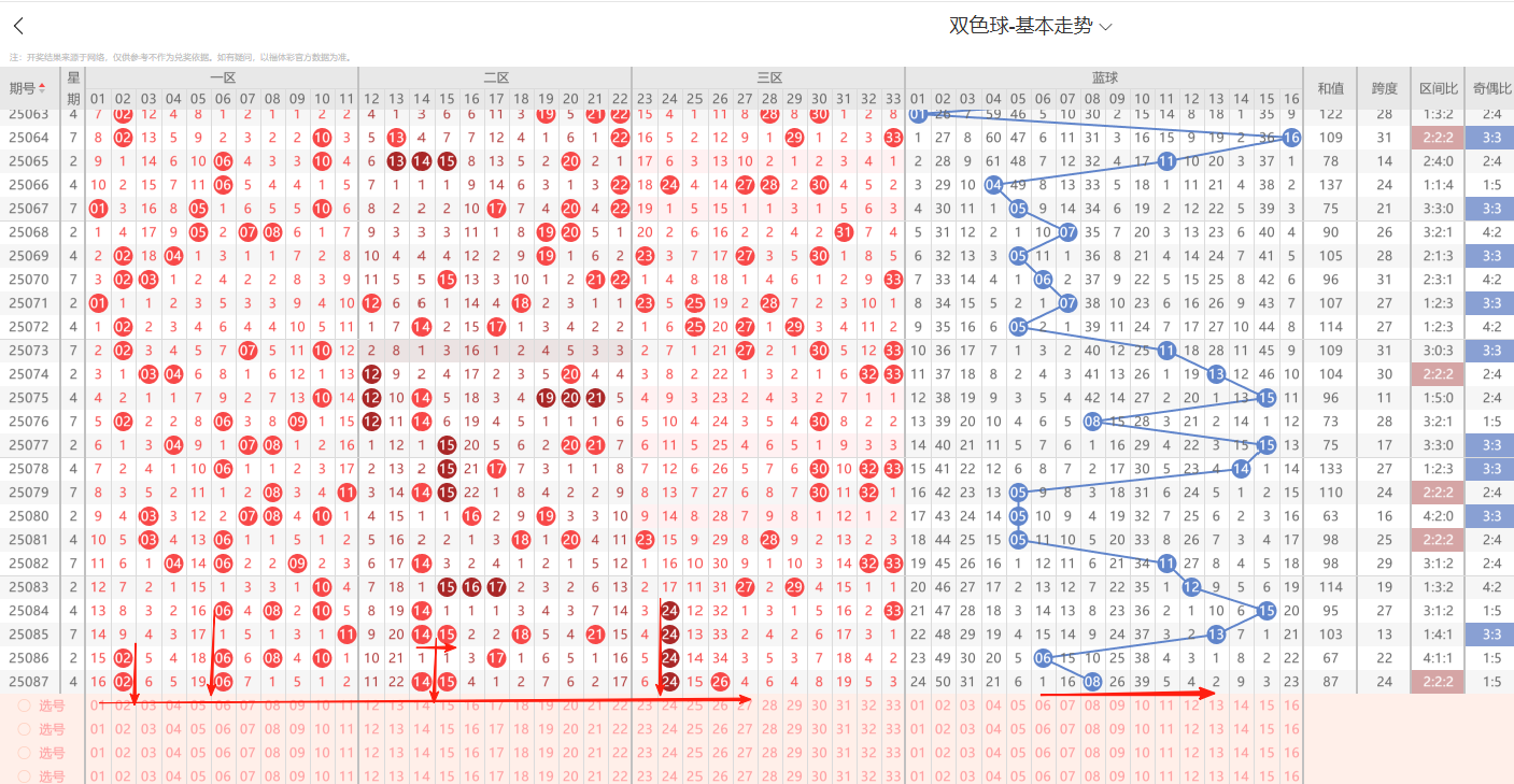 1、红球特征分析:(通过整体走势不难看出每期开奖号都具备以下明显的特征点)