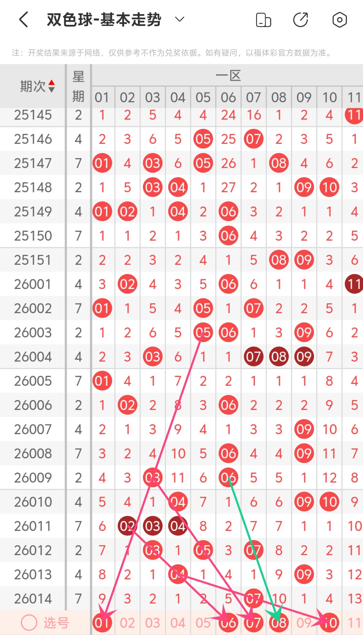 下面双色球的第一区间走势图分析: