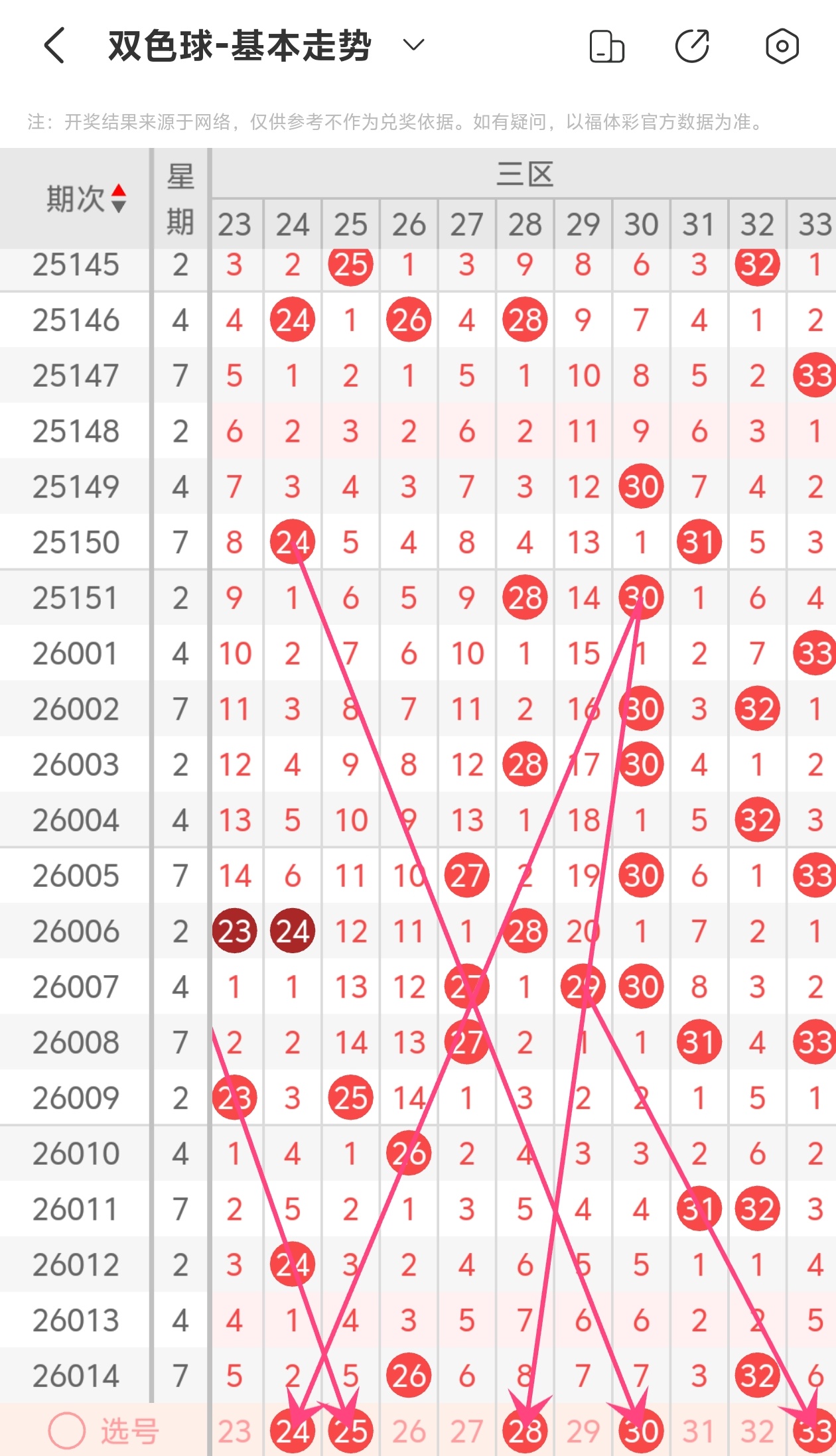 上期第三区间开出26 32,本期我们可以从上面走势图中看到选号的思路,24为斜连走势,25为斜连走势,28为斜连走势,30为斜连走势,33为斜连走势,综合以上分析本期第三区间推荐24 25 28 30 33