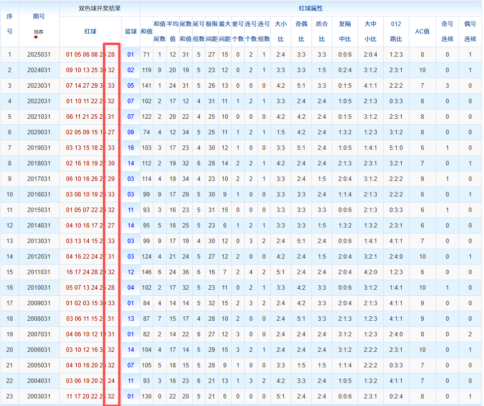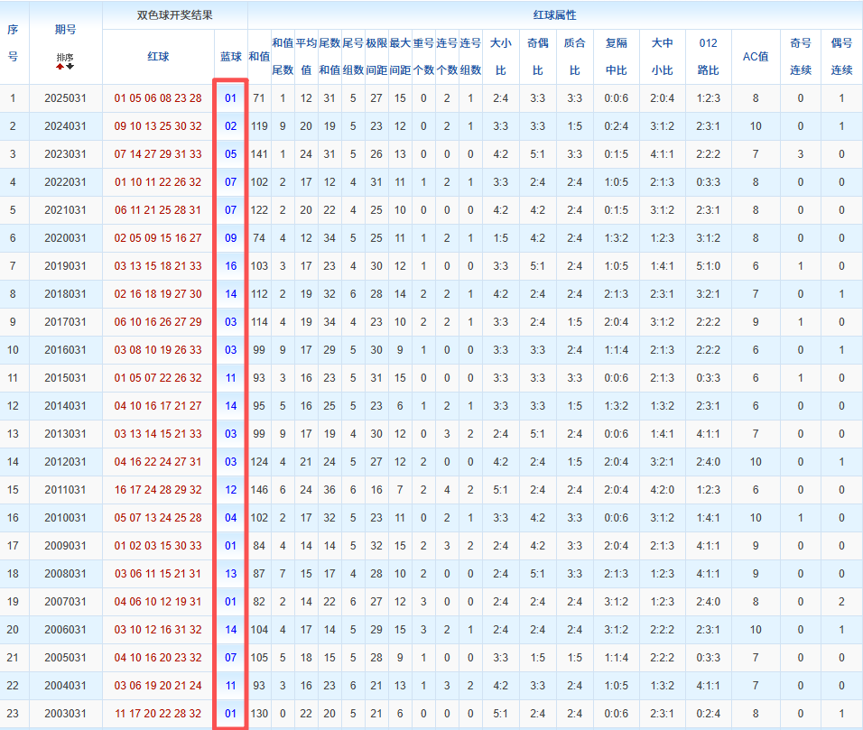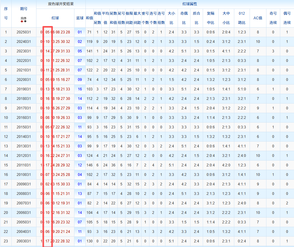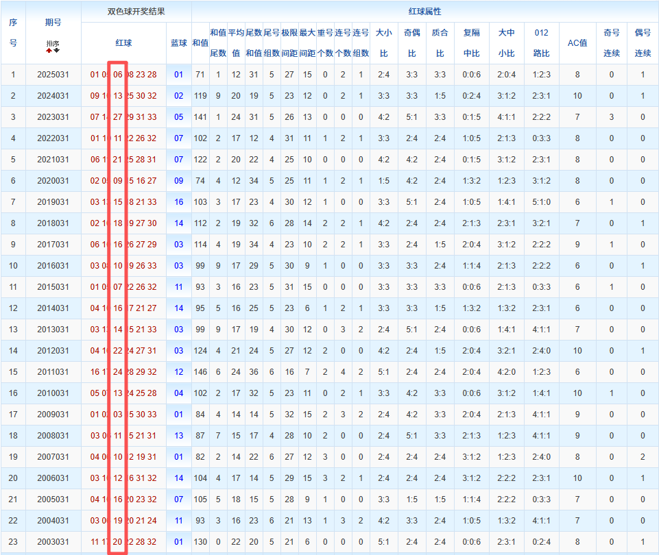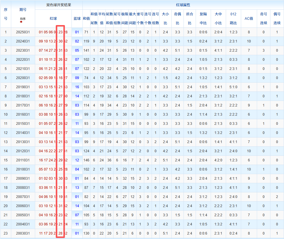 通过观察,我发现双色球往年同期的开奖数据与本期号码之间存在显著关联。具体来说,在红球中,从第一位至第六位,通常会有约4个位置上的数字与往年同期相同位置的号码一致;而蓝球号码中,也有多期开奖结果直接包含了往年同期的数字。因此,我们可以借助往年同期各位置上的号码,作为分析本期开奖情况的重要依据。在此基础上,还可结合往年同期的其他相关条件,进行综合性的号码组合推荐。