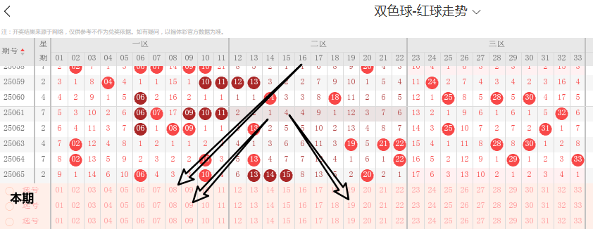 二、本期三个分区分析 红球区划分三个区间:01 - 11 为一区,12 - 22 为二区,23 - 33 为三区 。