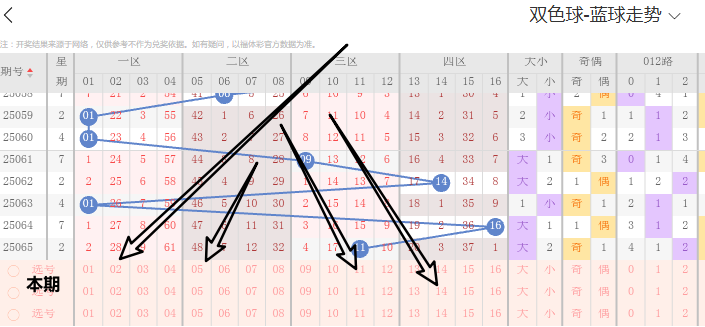 通过对近五期蓝球区开奖号码 09、14、01、16、11 进行 012 路归类,我们能够更清晰地洞察号码的出号趋势。 在近五期仅有 09 这一个号码出现,可见其热度处于一般水平,在近期的开奖中并未展现出强劲的出号势头,属于相对平稳的态势。1 路号码,也就是被 3 除余数为 1 的号码,有 01、16 两个号码现身,相比 0 路号码,1 路号码在近五期的表现稍显突出,呈现出尚可的出号状态,暗示其在近期的开奖中具备一定的活跃度。2 路号码,即被 3 除余数为 2 的号码,14、11 在近五期的两次亮相,使其成为三种类型中最为活跃的存在,显示出较强的出号惯性。 基于上述对近五期 012 路号码走势的深度剖析,综合考虑号码的冷热状态、出号惯性以及历史同期数据,本期为大家精心推荐 4 个蓝球号码:2、5、11、14。