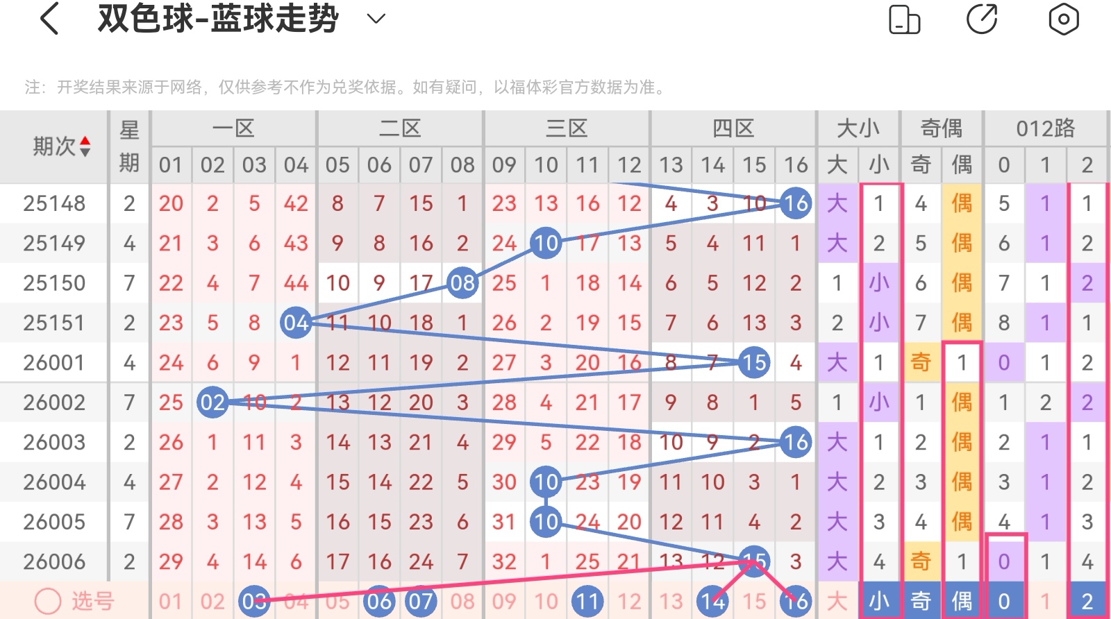 双色球第26007期基本走势分析 (上期会员文章胆码中一,重码中一,杀五蓝正确)