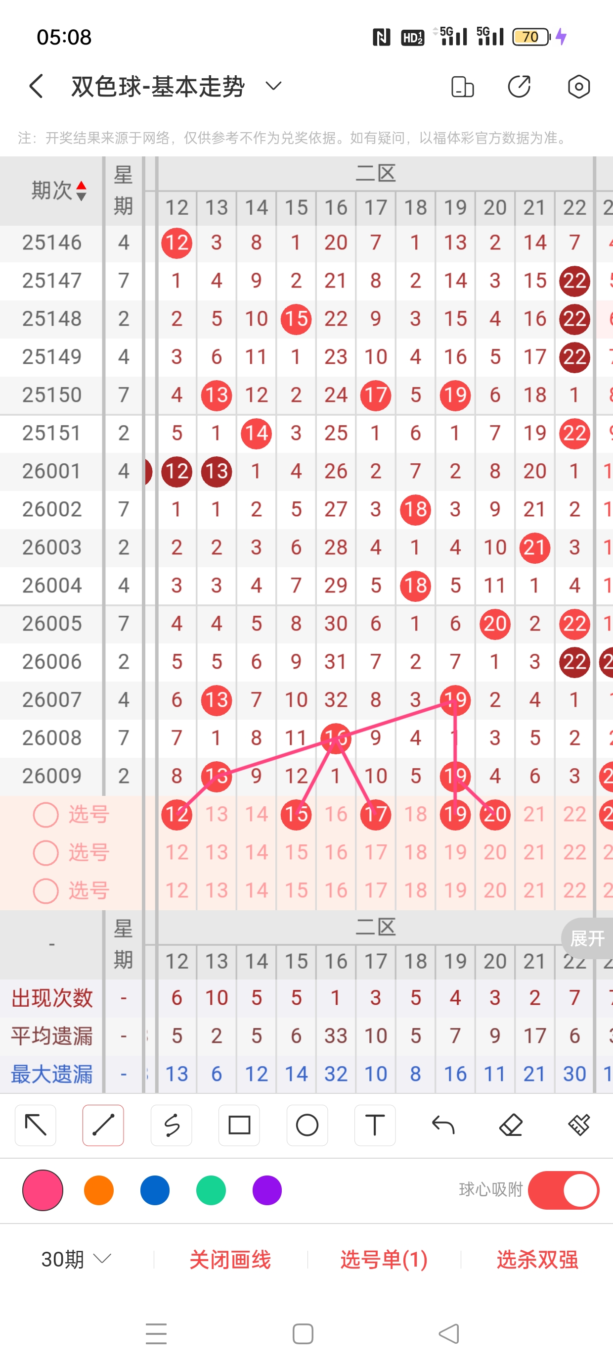 二区(12-22)近14期本区邻孤传2邻12孤0传,孤号热度高,本期着重邻传。近14期本区012路9:3:2,0路热度高,本期着重1/2路。12已遗漏8期,与13之间呈现向左遗漏递减态势,需防。15、17分别遗漏12期、10期,两者依托16呈现正三角遗漏递减态势,需防。19作为传号,20已遗漏4期,两者与19之间呈现向右对称遗漏递减态势,需防。