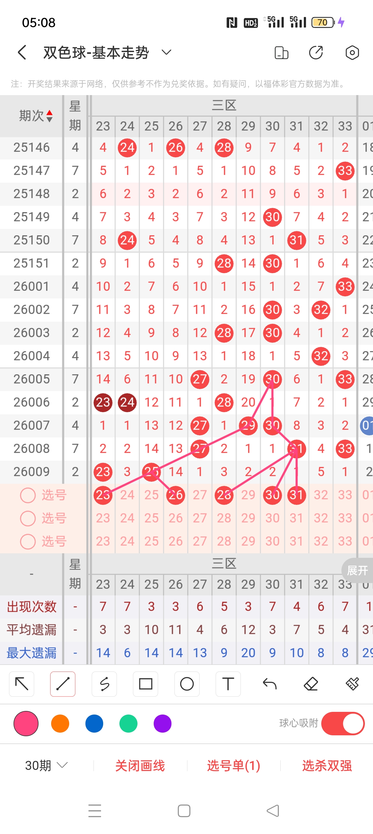 三区(23-33)近14期本区邻孤传6邻8孤0传,孤号热度高,本期着重邻传。近14期本区012路9:0:5,0/2路热度高,本着重1路。23作为传号,与25之间呈现向左遗漏递减态势,需防。26已遗漏14期,与25之间呈现向右遗漏递减态势,需防。28已遗漏3期,30、31分别遗漏2期、1期,三者与31之间呈现向左对称遗漏递减态势,需防。