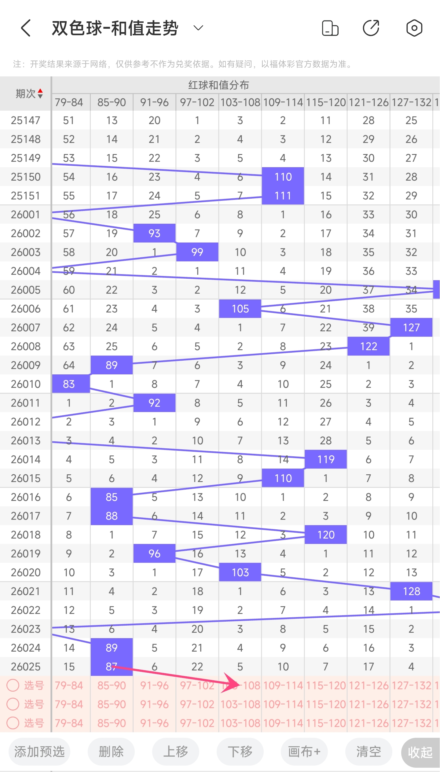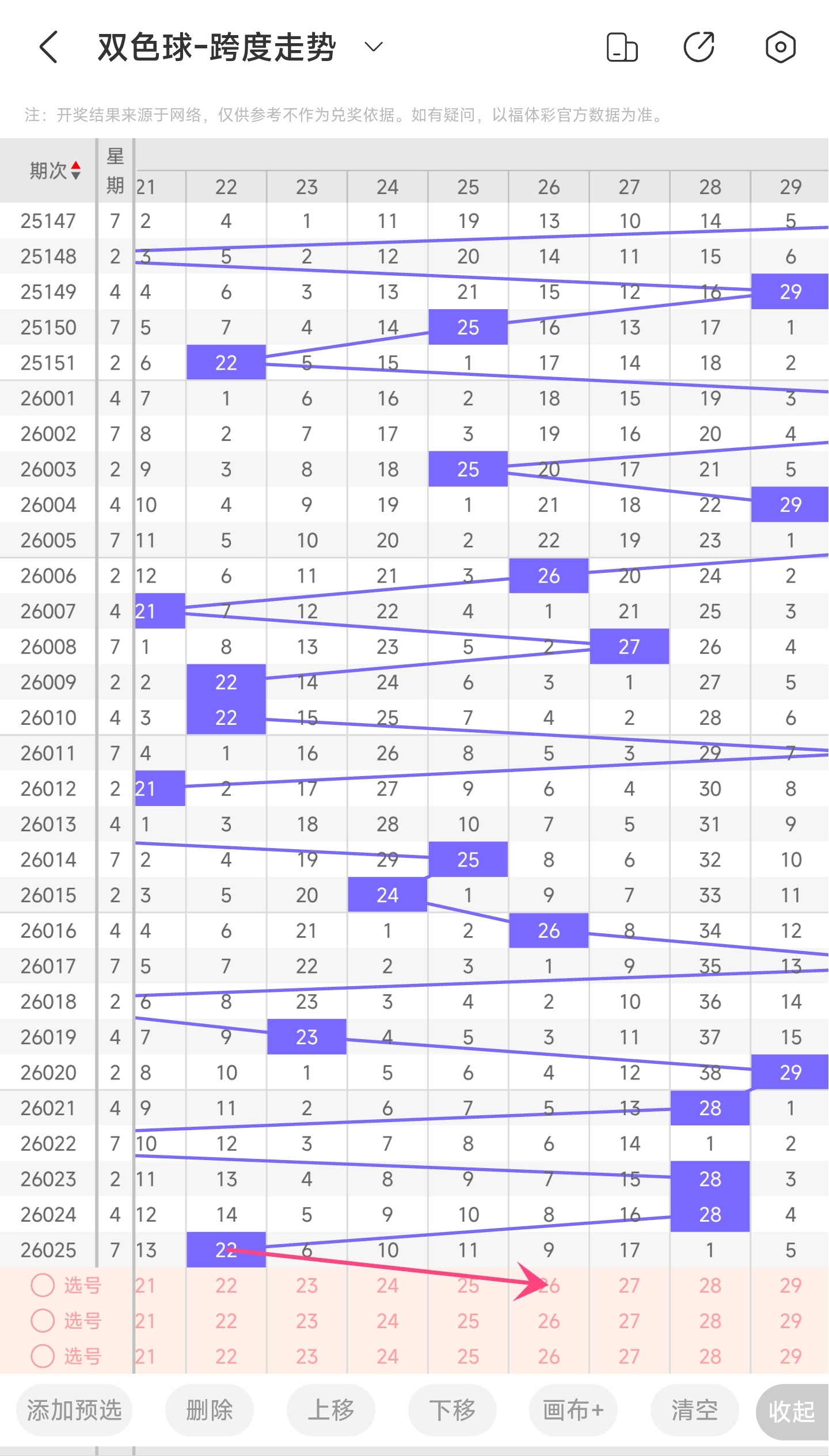 上期龙头为2,凤尾为24,跨度为22,往前一期跨度是28,偏移量为622跨度值是30期内开出比较小的跨度值。下降的空间比较小,上升空间比较大,本期看好跨度变大,所以推测本期跨度趋势是往右的,跨度变大,小概率往左,跨度变小。