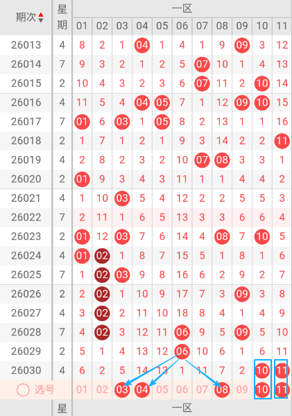 根据走势图可以看出当区段,021期开出03一个号码球 ,022期没有开出个号码球 ,023期开出01.03.08.10四个号码球 ,024期开出01.02二个号码球 ,025期开出个02.03二号码球 ,026期开出02.09二个号码球 ,027期开出02一个号码球 ,028期开出02.06.09三个号码球 ,029期开出06一个号码球 ,030期开出10.11二个号码球 ,按照如此规律本期当前区判断可能会开出1单1双。我们看下当前区上期没有开出重叠号,那么本期当前区要定重叠号的情况下可关注10号码球。再看下当前区段上期没有开出斜连号,当期选号得留意09斜连号。建议重点关注03.04.08.10.11