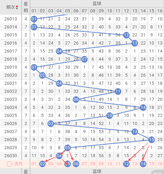 根据走势图近10期的走势看,蓝球在14期开出01蓝球之后,2大5小1大1小2大1小2大2小,再看下近10期的蓝球热码有回补的趋势,这种趋势规律本期判断极有可能开小号,本期防蓝球09大号,蓝球本期重点关注02,05,06,12,14