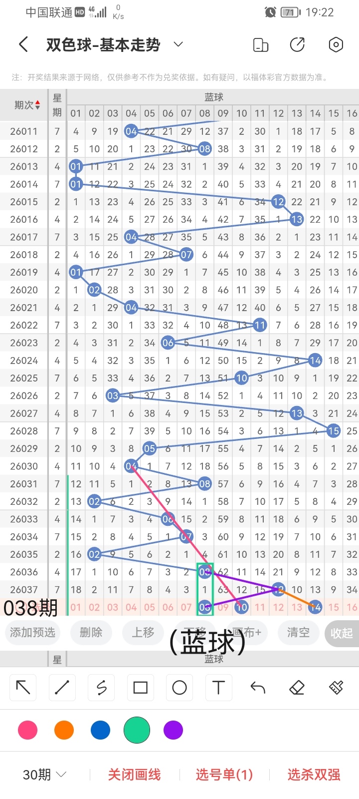 小梁结合上面图中画线思路分析得出,最后给大家汇总提供一下本期红球、蓝球数据,供大家参考: