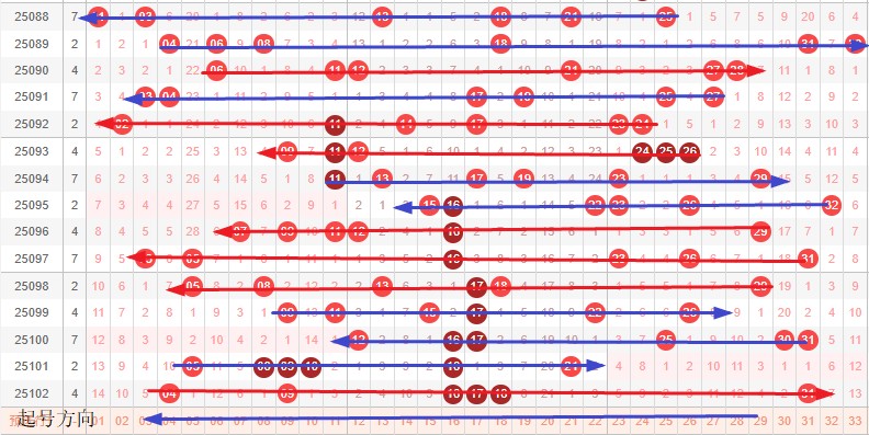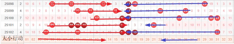 如图所示:体现的是3个局部走势的发展周期,圆圈为密集处的填空,本期定性为新局部走势5期主力填空第3期架构填空第2期,定性蛋跨为15-25,真实空间为1区的1-12,走势最后一期分别造成4-9和18-31空间反向操作,代表18-31属于压缩本期主力出号,4-9空间两边放大,代表本期大号多开。目前处在两走势,是继续形成两组连号还是分割成多组间隔1就是走势正反方向。