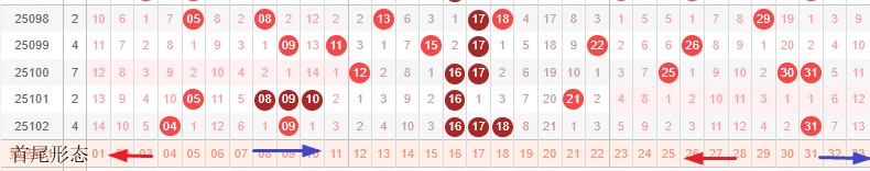 如图所示:首尾制约平衡组范围依次为:缩缩推,推拉? 本期形态范围优先选择红色左推首尾。由于上期号码已经进入新走势,目前处在3连号第2期,是继续形成连号还是分割走势即为走势正反,号码是左推还是右推处理,分别体现形成形态和分割形态,代表本期依旧维持中跨。优选红色左推首尾。
