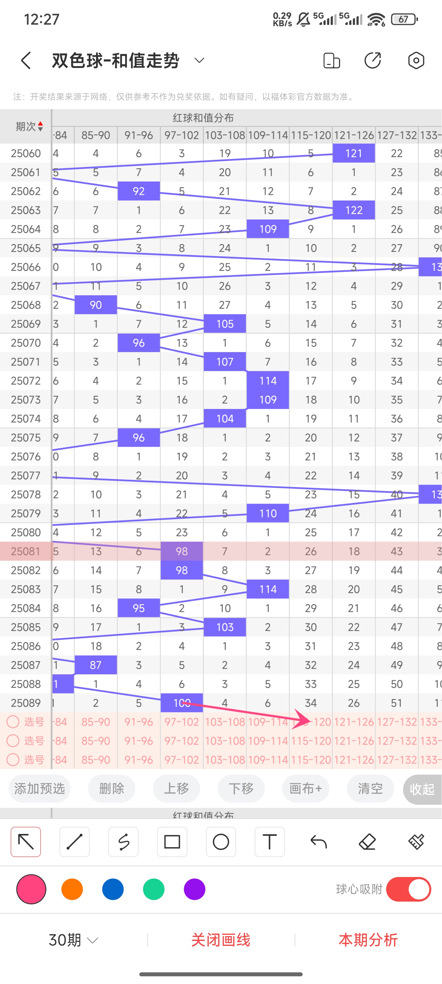 上期和值为100,而近5期和值为103,67,87,81,100均值87.6,上期和值较前一期增加了19,振幅为19。100和值是属于近30期内开出的和值中处于中等的和值,所以目前和值可能继续变大,也可能减少。但通过走势图分析,近几期开出的大和值比较少,所以本期大和值可能会回补。所以推测本期比较大概率会往右上升,和值增大。