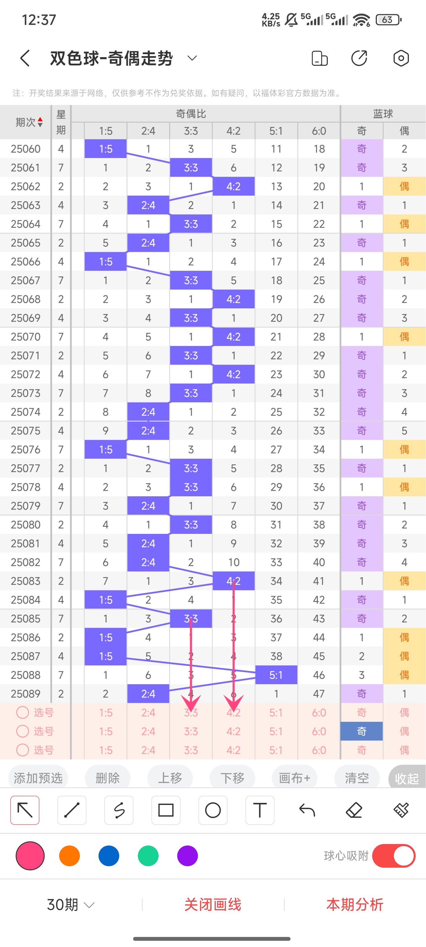 上期奇偶比为2:4,分别为偶偶偶偶奇奇。往前一期奇偶比为5:1。通过近30期内奇偶走势的数据分析,目前1:5奇偶比开出的概率是20%,3:3奇偶比开出的概率是33.33%,4:2奇偶比开出的概率是16.66%,2:4奇偶比开出的概率是26.66%,5:1奇偶比开出的概率是3.33%。其余类型为0%。通过分析走势图,4:2奇偶比和3:3奇偶比已经遗漏了好几期没有开出,上期开了2:4奇偶比,那么本期就是有比较大可能开出3:3奇偶比或者4:2奇偶比了。