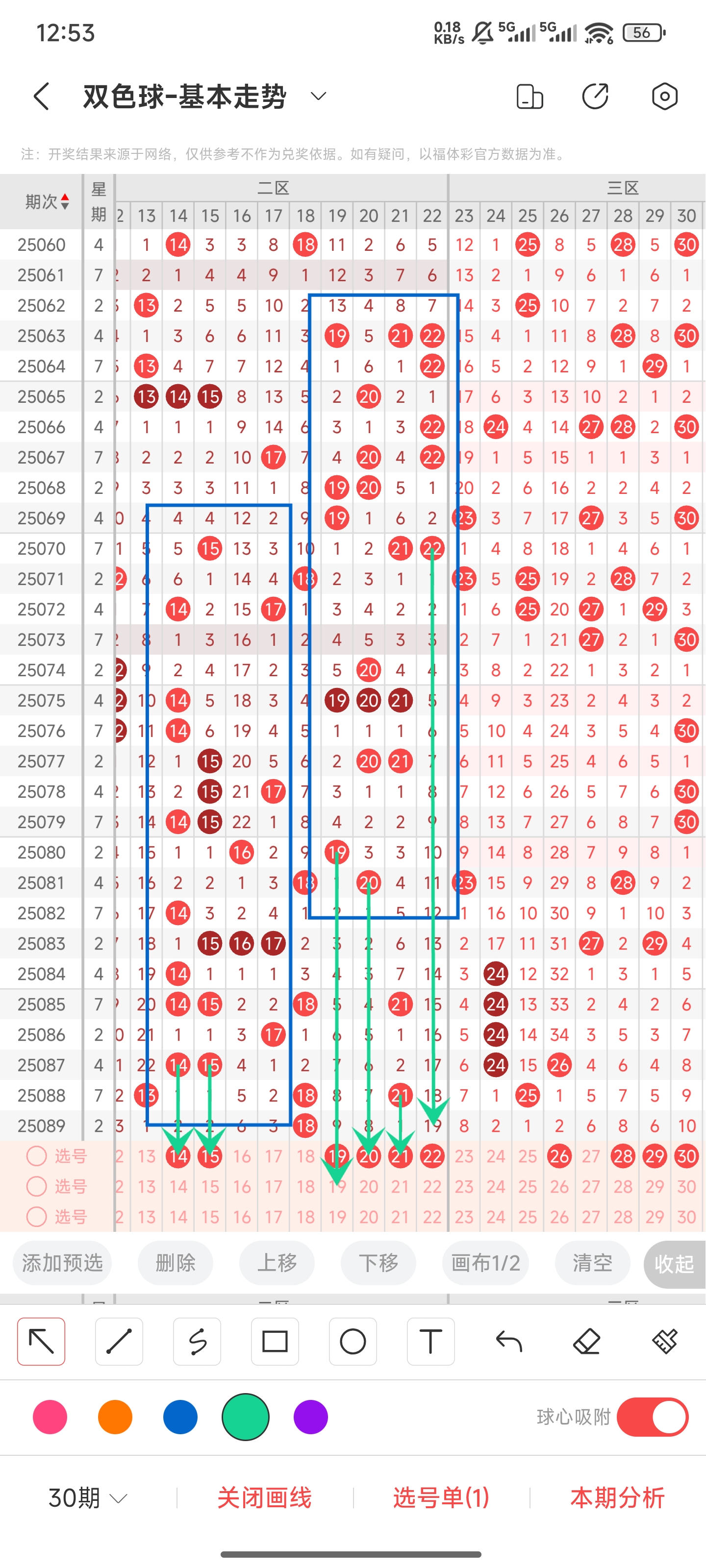 上一期二区开出为18。往前一期开出了13,18,21。因为18号球已经进行了连出,本期我们就不考虑继续连出的可能性了。通过分析二区的走势图,从整体上看,开出的数字都是比较集中在左右两边的。因为上期开出的18处于比较中间的位置,那么本期我们可以关注一下左右两边的数字了。同时结合冷热号和遗漏情况,左边我们可以关注14,15,右边我们可以关注19,20,21,22。所以综上所述推测本期可能开14,15,19,20,21,22等号码。