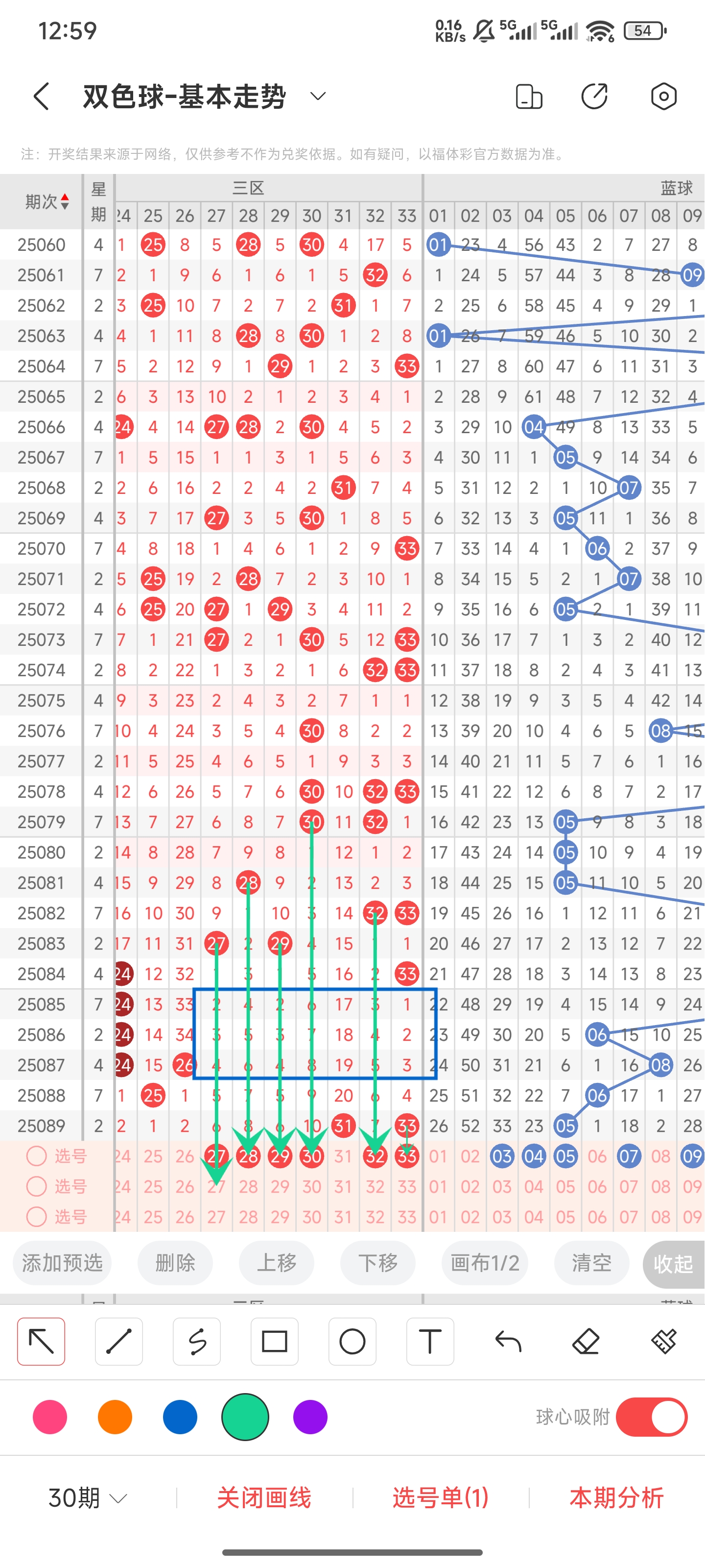 上一期三区开出31和33。往前一期开出的是25。33是一个很热门的号码,所以本期我们可以考虑连出。通过分析走势图,可以看出三区最近开出的数字都比较少,且开出的数字都比较集中在左半边,右边的数都遗漏得比较久了,所以上期进行了右边的回补,本期我们已经推测会继续进行回补。所以结合遗漏期数和冷热号,我们可以关注27,28,29,30,32等号码。综上所述本期我们推测有可能开出27,28,29,30,32,33等号码。